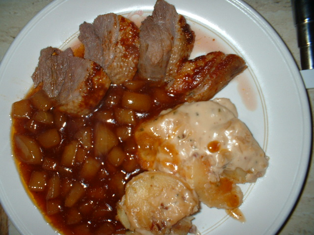 Sauce:Gänsefond,Birnensaft,Birnenwürfel,Bratensaft,